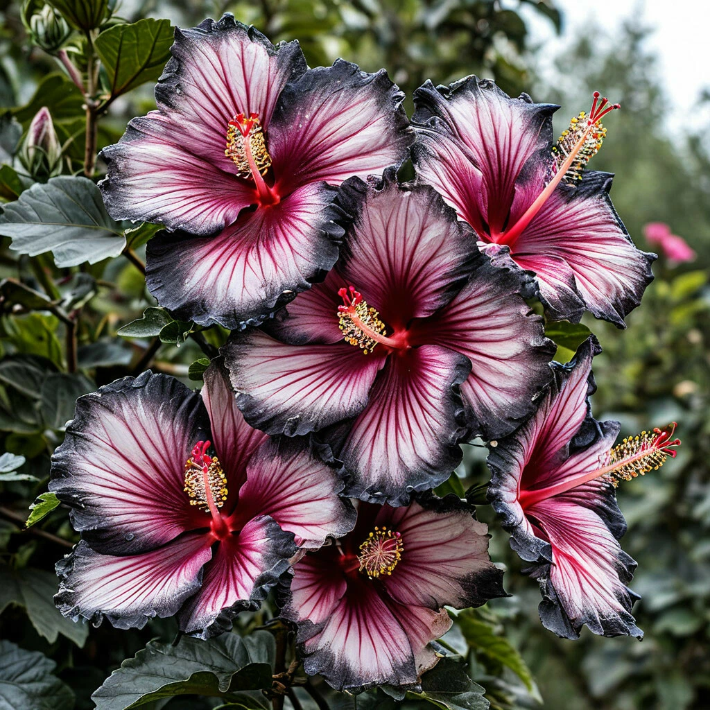 - Белый цвет с малиновыми прожилками и черными краями: главная особенность этого сорта — его уникальная и неповторимая окраска. Цветки гибискуса “Самер Бридж” имеют нежный белый цвет с тонкими малиновыми прожилками, которые создают эффект легкости и воздушности. Черные края лепестков придают цветку графичность и элегантность.